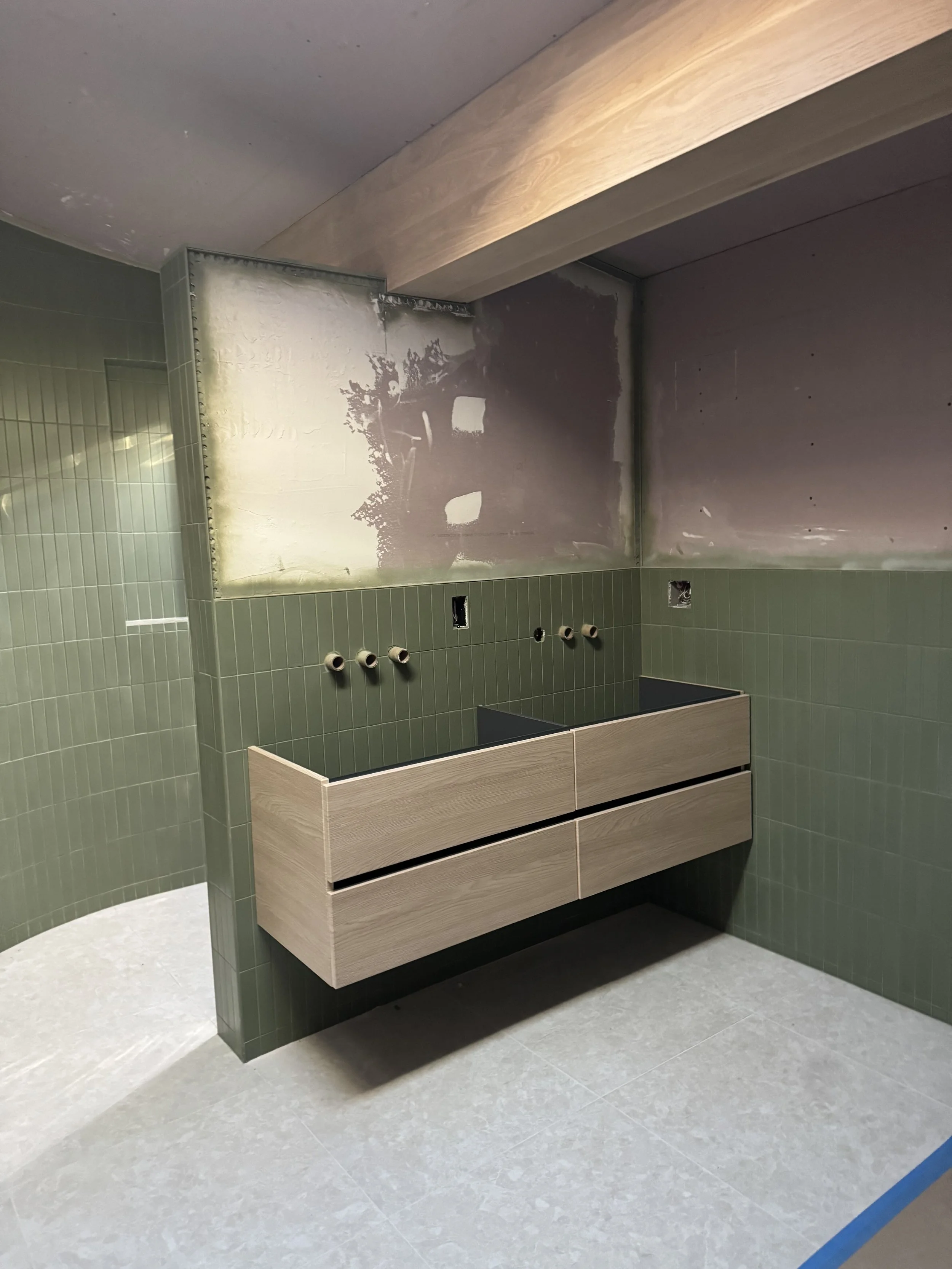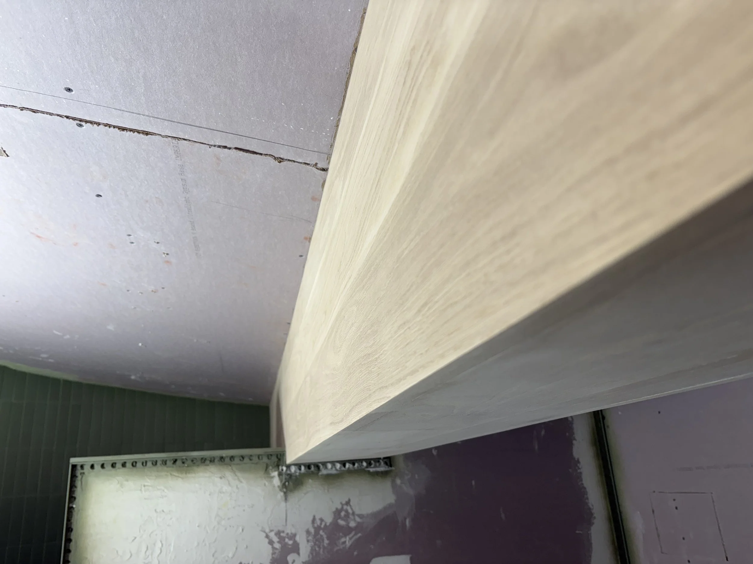Grit & Grain’s services extend beyond cabinets and built-in millwork to other sometimes unique beautification projects. In the photos below, you will see a recent LVL beam wrap and slat wall we did in central New Hampshire. This master bath is still under construction, but you can see the progress and attention to detail. The challenge here was to wrap the LVL beam in white oak with a minimal amount of joints…while the knee wall was already in place…challenge accepted!